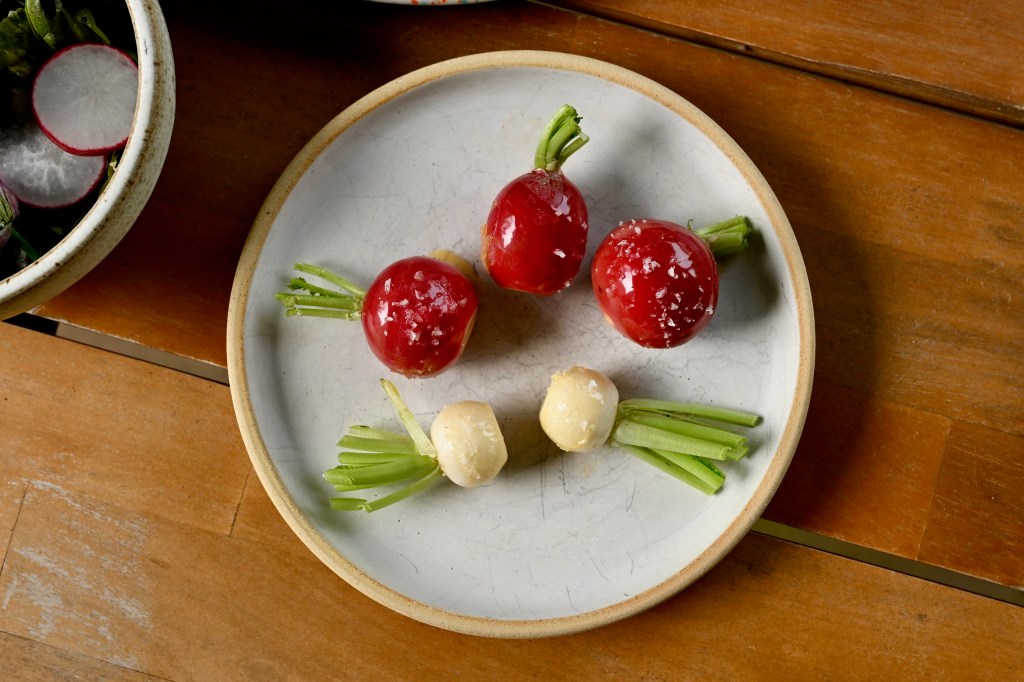 I also made a little side dish of radishes and turnips to crunch on. I melted butter with chili crisp, then dipped the veg in, sprinkled with sea salt and left to dry for just a few minutes for some very tasty bites.