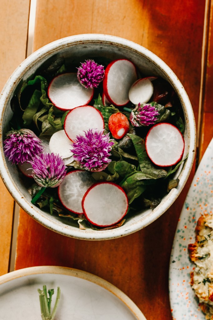 I used a mix of lettuce, mizuna, and pea vines for the base, and added paper-thin slices of radish and turnip for a peppery crunch. Fresh dill and chives added brightness, and I tossed it all in a simple lemon vinaigrette (olive oil, lemon juice, mustard, salt, pepper).
