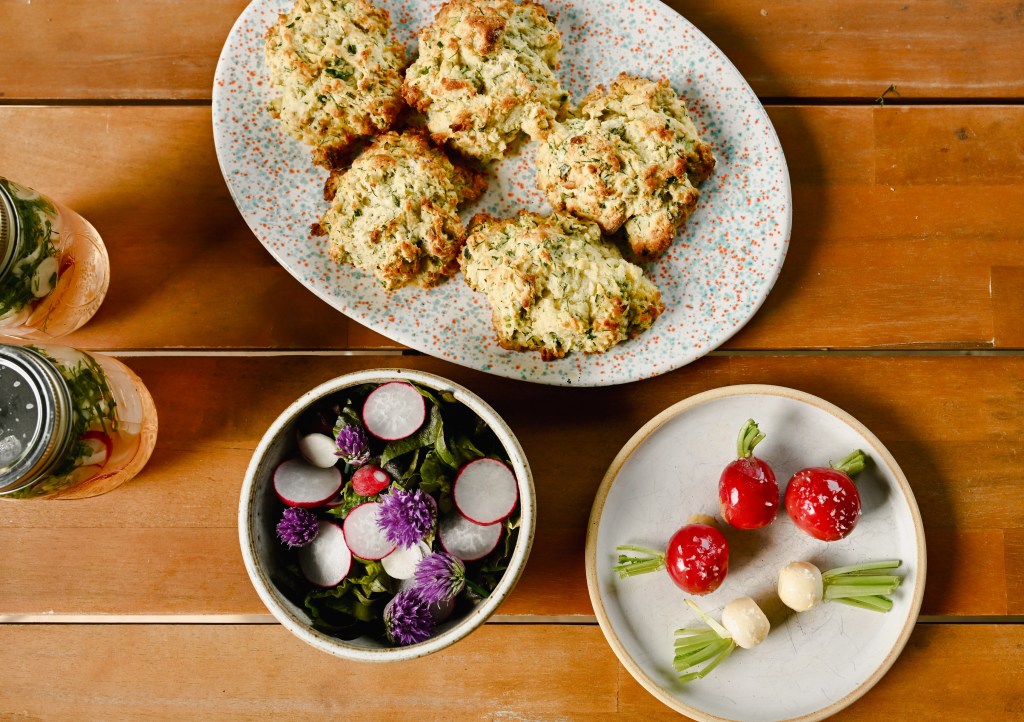 These buttery, herby biscuits were a hit. I mixed chives, dill, oregano, green garlic, and even some finely chopped pea vine leaves into a classic buttermilk biscuit dough. The result was fragrant and deeply flavorful—like a bite of spring morning.