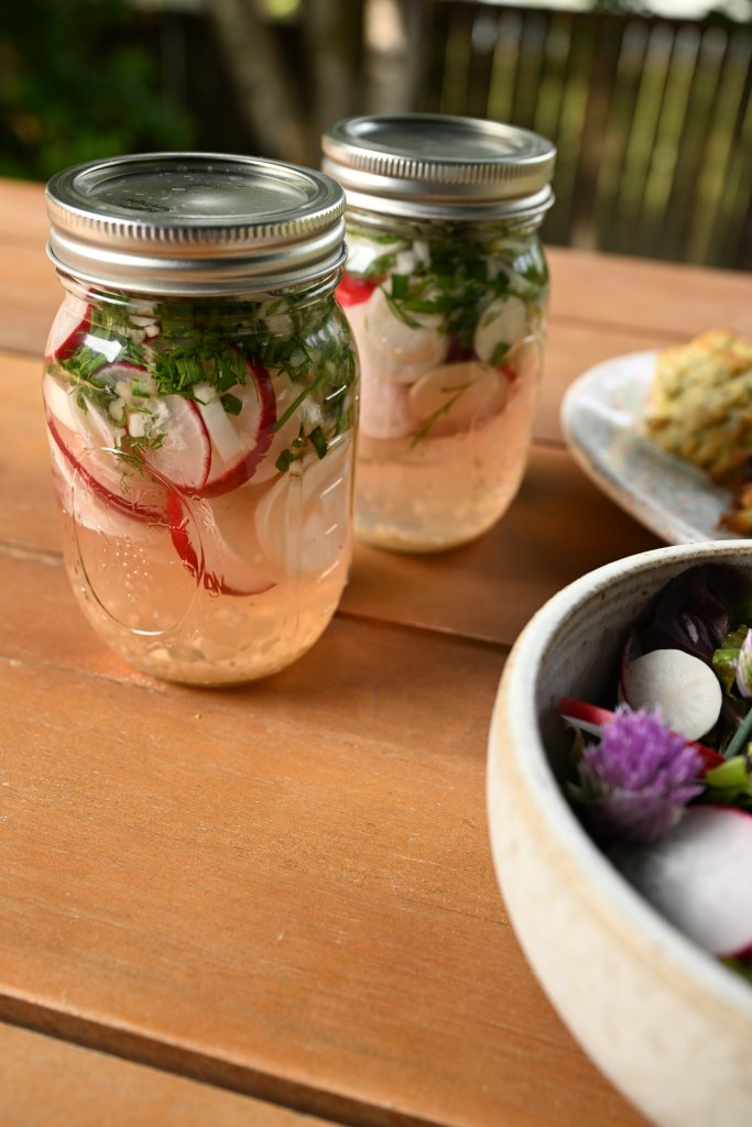 A quick pickle is one of my favorite ways to stretch the joy of spring veggies just a bit longer. I sliced the radishes and turnips thin and packed them in a jar with a hot brine of vinegar, water, sugar, and salt. I tossed in some green garlic, chives and dill for an extra flavor kick.
